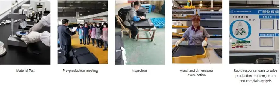 Táimid comhlíonta go hiomlán le ISO9001 maidir le dearadh agus déantúsaíocht mataí gluaisteán, ISO/TSI16949 maidir le rialú cáilíochta, ISO14001:2015 maidir le bainistiú comhshaoil, BSCI maidir le freagracht shóisialta, agus Caighdeáin REACH an AE maidir le hamhábhair. Tá áiseanna tástála intí againn chun féinseiceálacha a dhéanamh chun a chinntiú go n-éiríonn lenár dtáirgí tástálacha a dhéanann SGS, Intertek, nó aon chigire tríú páirtí eile a d’fhéadfadh a bheith ag teastáil ó chliaint.